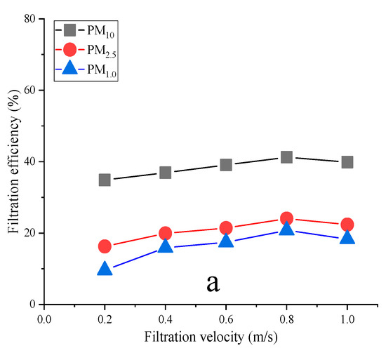 - The filtration of composite filter materials synthesized using different porous media reached maximum efficiency at an 0.8 m/s filtration velocity. The filtration efficiencies of composite filter materials for PM10, PM2.5, and PM1.0 increased by 1.67~26.07%, 1.19~26.96%, and 1.10~21.98%, respectively. Fabric c’s filtration efficiency for PM10 was 21.26% higher than that of fabric b; fabric c’s filtration efficiency for PM2.5 increased by 20.22% compared with fabric b’s; and fabric c’s filtration efficiency for PM1.0 was 18.50% higher than that of fabric b. The composite filter material made of reduced graphene oxide after synthesis had better overall filtration efficiency.