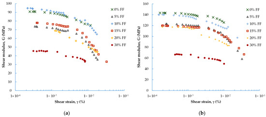 Regardless of the FF content, there is a strong relationship for each blend between the G and D parameters and the mean effective stress (p′). The increase in the stiffness of the mixture and the decrease in the mixture’s damping characteristic with increasing p′ is comparable to the stiffness and damping characteristics of natural soils. It can be observed that the relationships for G = f(γ) and D = f(γ) could be well-fitted by a polynomial function.