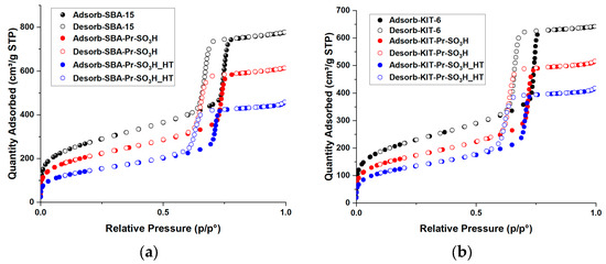 The discussion on the N2 adsorption–desorption isotherms of pristine supports and related sulfonic derivatives obtained both by thermal or hydrothermal grafting is herein deepened with respect to previous work to better define the relationships between catalyst characteristics and performances. The isotherms showed a type IV shape with a H1-type hysteresis loop (Figure 5a,b) [54]. These isotherms are typical of mesoporous materials with a high surface area and the presence of cylindrical channels arranged in a hexagonal honeycomb-like structure. After thermal grafting with propyl-sulfonic groups, an evident reduction in the amount of nitrogen adsorbed is observed as a consequence of the reduction in both surface area and pore volume.