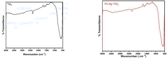 FTIR spectra of pristine TiO2 and TiO2 nanomaterials doped with 1, 2, 3, and 4% Ag.