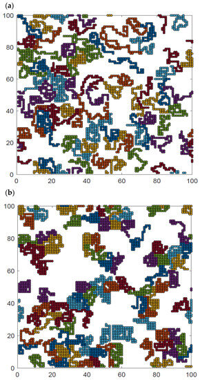 - Sikorski, A. The Influence of the temperature on the percolation threshold in two-dimensional polymer systems. Comput. Methods Sci. Technol. 2020, 26, 143–149. [Google Scholar]
