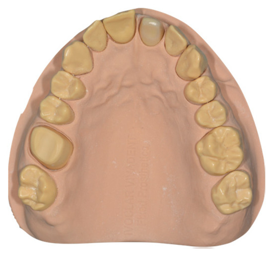 A reference maxillary typodont (MT) mounted on a simulator phantom head was fabricated by performing a vertical preparation for full coverage on resin abutments on maxillary right first molar #16 and left first incisor #21. Teeth preparations were performed with the following protocol: mesio-distal preparation with a flame bur 012 (Komet, Lemgo, Germany) preparation of the occlusal surface following the angle of the cusps using a conical burr (Komet, Lemgo, Germany), and axial reduction above the buccal and palatal cemento-enamel junction with the 012C flame diamond burr. Thus, a circumferential tooth reduction was obtained using a flame bur 012C vertically below the cemento-enamel junction until the preparation is rectified with the axial plane. In order to standardize the scanning condition, the preparation was performed at least 2 mm around the gingival margin to ensure the overcome clinical limit, which was confirmed with a periodontal probe (CP 15 UNC; HU-Friedy, CHI, Chapel Hill, NC, USA). The final MT model is shown in Figure 1.