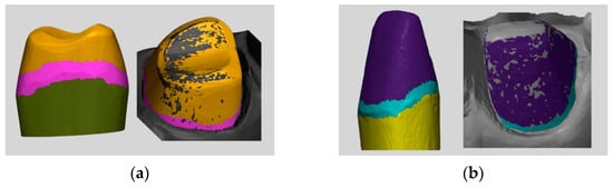 In order to evaluate the difference in the subgingival marginal area, the single prepared abutments models for 16 and 21 were selected, as reported in Figure 3. The 3D comparison was performed as previously reported after the alignment of the abutment model with the 10 different scans were obtained per each group.