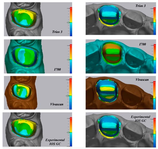 As it can be evaluated in the color map images in Figure 4 and Figure 5, the prevalence of cold colors at the marginal level revealed as the IOS abutment surface did not penetrate into the reference scan surface. Thus, it seems that the IOS was not able to record the true abutment surface into the sulcus when, at the marginal level, it was closer to the tissue surface. A possible explanation of this finding is related to the continuous surface generated in the software by “joining the dots” according to the “stitching” algorithm.