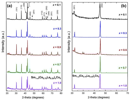 X-ray diffraction plots (Cu Κα radiation) of Sm1−x(Ce0.75La0.25)xCo5 (x = 0.1–1.0) compounds; (a) powder samples; (b) magnetically oriented samples.