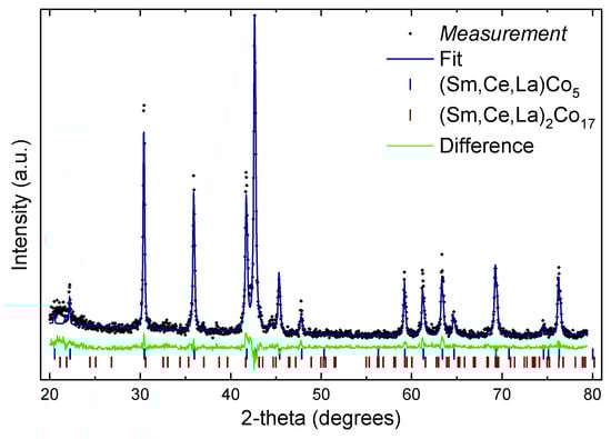 In Figure 2, a plot of the sample with x = 0.5 combined with a theoretical fit using Rietveld analysis is provided. The amount of the secondary, Th2Ni17-type phase (S.G. No 194, P63/mmc) is about 9 wt.%. In all cases the amount of secondary phase was between 3 wt.% (x = 0.1) and 10 wt.% (x = 0.7) while the quality of the fit in all cases was about 2–3% higher than Rexp, for example in the case of x = 0.5, Rp = 19%, Rexp = 16%. We have examined the possibility of existence of both main variants of 2:17 phases, Th2Ni17-type and the rhombohedral Th2Zn17-type (S.G. No 166, R −3 m) and a combination of both. Due to the small amount of the secondary phase, there is no clear result. It is known that Sm2Co17 usually crystallizes in the rhombohedral variant and Ce2Co17, La2Co17 mostly in the hexagonal [,]; both have the same basal plane, the same orientation of the c-axis and occur from 1:5 with the same amount of replacement of rare-earth atoms with transition metal pairs, their difference is due to the stacking sequence [].