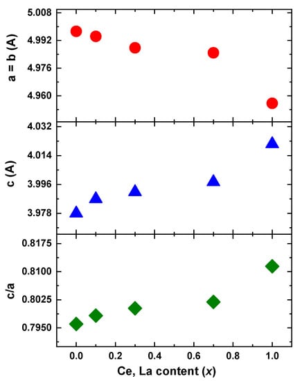 From the values of the table and the Figure 3 some clear trends are observed. The introduction of Ce, La decreases the basal plane unit cell parameters while it increases the perpendicular c-axis. The c/a ratio increases as well. It is well known [,,] that the hexagonal RCo5 compound crystallizes in a layered structure, where Co only Kagome layers alternate with mixed R-Co layers. The hexagonal Th2Ni17-type phase is very related to the basic structure and is produced by the partial replacement of one third of rare earth atoms with pairs of transition metal, aligned parallel to the c-axis of the structure and called dumbbells. Slightly disordered variations or other impurities are also very common in the system []. The incorporation of different rare earth atoms, as in our case, may enhance such effects. The small variations in peak intensities in Figure 1 may relate to such structural and compositional discrepancies. The magnetic properties are obviously sensitive to these parameters but the close structural relation of them is not an obstacle from the applications and industrial manufacturing/processing scope.