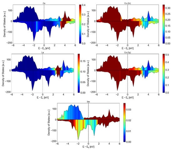 The results of DFT calculations for the atomically resolved, electronic DOS for a Ce0.75La0.25 content of x = 0.5 in the energetically preferable structure are presented in Figure 4. The contribution of the Co sublattice to the electronic states for both the 2c and the 3g sites dominates a broad range close to the Fermi level and pronounces its importance for the magnetic properties of the RE-Co5 structure. The peaks associated to the Ce atoms are close to 4 eV, while the ones associated to the La atoms are close to 3 eV. The contribution of Sm atoms is found to less pronounced and over a broader range above the Fermi level. The respective average magnetic moments for each atom type are also presented in Table 2.