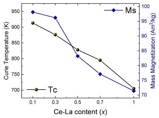 Thermomagnetic analysis under small, constant magnetic field was used to determine critical transition temperatures (Table 3, Figure 5). For all stoichiometry range a drop in the Curie temperature is observed, almost linear with Ce-La content. Mass magnetization follows the same trend as Curie temperature, reflecting the overall weakening of the magnetic interactions (Figure 4). It is interesting to observe that ab-initio calculations for the sample with x = 0.5 present a larger magnetization compared to the experimental evaluation. Imperfections and minor impurities may account for that difference. The structural effects we have already described are an additional cause for this weakening of the magnetic properties. For low Ce, La Misch Metal content the degradation of the intrinsic magnetic properties is rather small, thus it is reasonable to consider the possibility of using Ce/La dopped SmCo5 as a base material for preparing permanent magnets due to the reduced cost. Chen et al. [] have demonstrated that such doped Sm-Co / a-Fe nanocomposites present adequate remanence and coercivity and in addition to the other commercial and production factors which have been already discussed here are an interesting choice for PM optimization. We must also take into account the fact that Ce and La are the rare earths with the largest production volume and are considered as oversupplied raw materials []. Their large availability and lower price may be considered for confronting the balance problem in the rare earth raw materials supply.