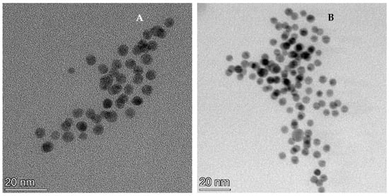 The obtained fractions of biomass were subjected to microscopic examination (TEM) in order to identify SeNPs, in case of their formation. Nanostructures were identified only in the total protein fraction (Figure 3). From the obtained images, it can be seen that SeNPs formed in the protein fractions were scattered and spherical, with a size in a range of 2–8 nm (Figure 3). The size of nanoparticles, including selenium, determines both their ability to reach target tissues as well as their retention capacity. Small-sized nanoparticles exhibit significant tumor targeting, with minimum to no nonspecific uptakes, but are also characterized by faster elimination []. A final hydrodynamic diameter of nanoparticles smaller than 5.5 nm resulted in their rapid and efficient renal excretion and elimination from the body [,]. However, recently, this statement has been questioned, since even nanoparticles of larger sizes but with specific properties are easily eliminated through the kidney []. Nevertheless, small nanoparticles are quickly eliminated from the bloodstream through the kidneys. This is of major importance when SeNPs are applied in cancer treatment—nanoparticles that have not been accumulated by tumor tissues are quickly removed from the bloodstream, thereby preventing undesirable effects on other tissues and organs.