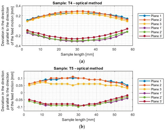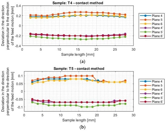 Although the deviations for sample T3 do not reach the largest values, they are very unstable. The surface of this sample is severely deformed after machining, which also presents a very irregular graph shape that indicates that its thin-walled surface is twisted. Smooth graphs (without significant anomalies) and relatively stable values of surface deviations were observed for samples made with the tool for general purposes (T1 and T4) and the tool for high-performance machining (T2 and T5). The presented graphs for these samples, depending on their length, assume a near-horizontal shape, and their values in the range of the sample are comparable, without much mutual scatter between the planes.
