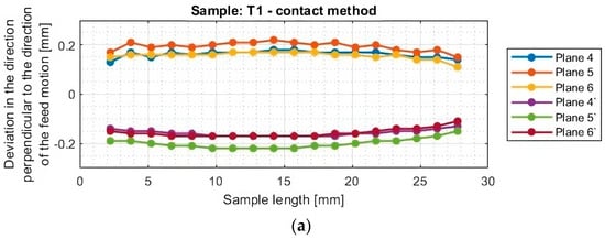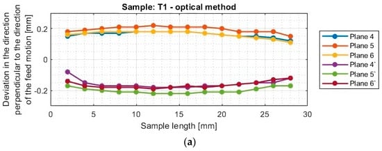 The graphs of deviations in the perpendicular direction presented in Figure 13 confirm the relationship observed when analyzing the results in the parallel direction. One notices an approximately symmetrical distribution of deviations concerning the horizontal axis passing through the zero point (y = 0) for samples T1–T2 and T4–T6. The symmetrical distribution occurs between planes occurring in the same section, i.e., between plane 4 and plane 4′, between plane 5 and plane 5′, and between plane 6 and plane 6′. As previously mentioned, on this basis, it is concluded that the thickness of the thin wall is close to the assumed value of 1 mm. For sample T3, the shift of the graphs toward positive deviation values was confirmed, so a thin-wall thickness of about 0.2 mm more than assumed was obtained.