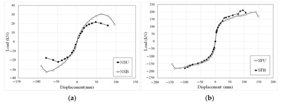 To compare the maximum load and drift ratio for each specimen, the skeleton curves are shown in Figure 8. The maximum loads and displacements of all specimens are listed in Table 5. The maximum load and maximum displacement of NSU were approximately 34% and 18% of that of NSB, respectively. As applying bidirectional loading, in-plane torsion due to lateral loads and out-of-plane torsion due to axial loads act on the same axis of load decreased torsional moment. In the case of the specimen in which unidirectional loading is applied, because the axes of the lateral and axial loads did not coincide, the in-plane torsion caused by the lateral load affected the failure of the specimen. The maximum loads of SFU and SFB were recorded as 198.32 kN and 226.22 kN, respectively, and the maximum displacements were 148.76 mm and 105.06 mm, respectively. The maximum load of SFB was 1.14 times that of SFU. The maximum displacement of SFU was 1.41 times that of SFB. More torsion was generated in SFU because axial load and lateral load did not apply coincidence, and eccentric axial load in SFB generated out-of-plane torsion. Therefore, in the case of SFB, which applied bidirectional load, the maximum load increased, although the maximum displacement decreased that of SFU.
