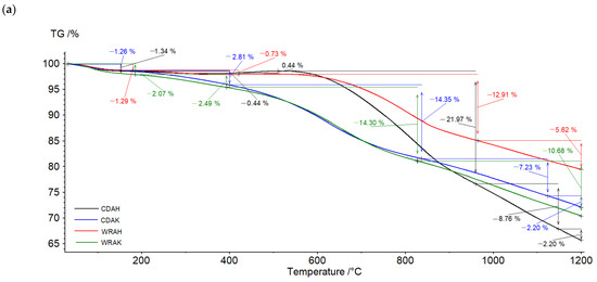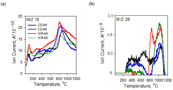 The character of TG and DTG curves presented in Figure 4 indicates that the activated carbons show different thermal stability, dependent mainly on the procedure of activation. Irrespective of the precursor type, the samples activated with potassium carbonate are characterized by smaller thermal stability than the analogous materials subjected to activation in the orthophosphoric acid presence. As reflected by the TG and DTG curves, the process of thermal decomposition of the activated carbon structures occurs in several stages. The mass losses change in the range from 1.26% (for the CDAK sample) to 2.07% (for the WRAK sample, Figure 4a), and the corresponding peaks on the DTG curves (Figure 4b) are related to the endothermic process of physically adsorbed water removal (dehydration process), which is clearly visible in the MS spectra characteristic of water (Figure 5a, m/z 18). At higher temperatures, the pyrolysis process is associated with the decomposition of oxygen functional groups present on the activated carbon surfaces. In the temperature range of up to 400 °C, the observed mass losses are the smallest for the CDAH (0.44%) and WRAH (0.73%) samples. In the case of these samples, an increase in the signal for CO2 was also recorded (Figure 5c, m/z 44), which was most probably related to the decomposition of carboxyl groups. For the remaining two activated carbons, the observed mass losses were much greater (2.81% for the CDAK and 2.49% for WRAK samples) with the simultaneous release of CO (Figure 5b) and CO2 (Figure 5c). This indicates the thermal decomposition of carboxyl groups (CO2 emission), carboxylic anhydrides (CO and CO2 emission), as well as lactone groups at higher temperatures (CO2 emission). Mass losses greater than 14%, recorded for the CDAK and WRAK samples at about 810 °C are mainly related to the emission of CO2 and smaller amounts of CO, which can indicate the decomposition of surface lactone groups (CO2 emission) and carboxylic anhydrides (CO2 and CO emission). In the case of the other examined activated carbons, clear peaks on the DTG curves are observed at higher temperatures, i.e., at 834 °C (with a mass loss of 22%) for the CDAH and at 812 °C (mass loss of 13%) for the WRAH samples. They are related to the emission of CO2, CO, and H2O, resulting most probably from the decomposition of phenolic (CO), ether (CO), and carbonyl (CO) groups, as well as pyrone-like structures (CO2, CO). Above 900 °C, further decomposition of pyrone-like structures takes place. The lack of peaks in Figure 5d (presenting the m/z 78 ion emission) indicates that no benzene derivatives were found in the gaseous products of decomposition, which could mean that there are no aromatic groups on the activated carbon surfaces.
