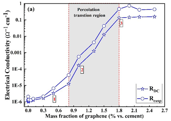 Figure 3 shows the AC measurement plots for the graphene/cement composites. Nyquist curves contain two arcs, namely the high-frequency and low-frequency arcs, respectively. Graphene particles behave as insulators at low frequencies, which have negligible effects on composites’ electrical conductivity. In contrast, displacement currents shorten graphene particles’ double layers at high frequencies, making them conductive (i.e., graphene particles act like short-circuit currents). Therefore, the significant decrease of electrical resistivity at the region of high frequencies is due to improvement in the conductivity by these conducting graphene particles. The low-frequency cusp corresponds to the DC resistance of cement/graphene composites, as shown by the solid symbols in Figure 3 [21,22]. Meanwhile, the high-frequency cusp, Rcusp, referred to as the electrical resistivity at high frequency, is also highlighted in Figure 3.