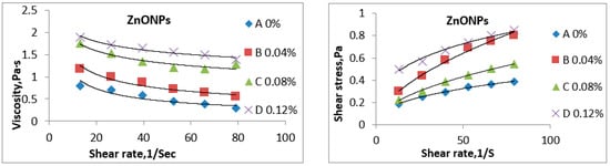 1. The parameters (shear rate and shear stress) to choose the best solutions for edible film nano edible coating and films solutions combined with ZnONPs and ZnONPs/EPP were measured using Brookfield Engineering Labs. DVN EXT. BROOKFIELD AMETK- At room temperature, the most appropriate solutions are selected. The methodology of work Put the sample transformer in a water bath at a constant temperature to maintain the desired temperature and then run the viscosity device between 10 and 60 rpm The spindle sc4-18 was selected for measurement.