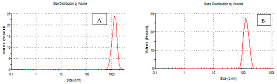 The results obtained are shown in Table 2 and Figure 2. At treatments (E20%, F40% and G60%) were higher than the treatments A 0%, B 0.02%, C 0.04%, D 0.06%, E 0.02%, F 0.04% and G 0.06% in both polydisparity index (PdI) and hydrodynamic diameter of particle size (nm). It was found that the peak was (0.648, 0.503, 0.771, and 134, 824.6 and 966 nm) for B 0.04%, C 0.08%, and D 0.12%, respectively. While the peak was E 0.04%, F 0.08% and G 0.12%, the peak was (0.639, 00.650, and 0.503 and 110.6, 188.7, and 873.6 nm) respectively, as compared with initial control samples’ A 0% practical size distribution (nm) in both poly dispersity index (PdI) 0.450 and hydrodynamic diameter of partical size (nm) 1319. A decrease of about 200 nm in the particle size around the charges in the aqueous solution was also observed after the treatment. Where the nano size appeared at around 450 nm, which led to a decrease in the particle size, the zeta potential value decreased. Suspended particles with zeta potentials of above +30 or less than −30 mV repel each other because they are considered stable, but if the zeta potential is between +30 and −30 mV, they tend to attract each other [40,41].