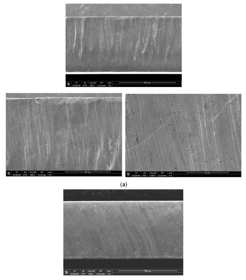 Compared with the No. 21 sample, the cutting speed of the No. 7 sample was lowered by 5 m/min, the pressure of the auxiliary gas N2 was increased by 0.5 MPa and the defocusing amount was increased by 0.5 mm. Figure 6a,b shows that the cutting edge of the two samples under the laser cutting is relatively flat but with visible molten columns. Sample No. 7 exhibits the relatively finer and denser molten columns, which is believed to be more attributed to the lower cutting speed. Figure 6c,d demonstrates that the plastic deformation near the cut line (upside of the figures) can be clearly seen in the sample manufactured using mechanic shearing. Figure 7 further demonstrates that although there were processing marks on the cut edge induced by the laser cutting process, the quality of the cut edge from laser cutting is much better than those processed by mechanic shearing, even with the observable grain boundaries. In addition, it is found that the quality of the cut edge closely depends on the laser cutting parameters.