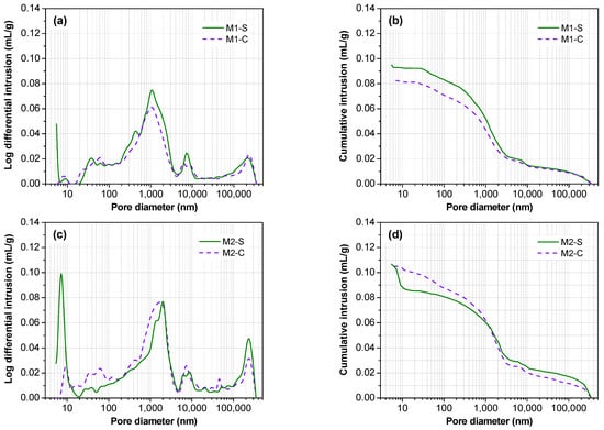 Pore size distribution of different MPC concrete samples. (a) log differential intrusions of M1, (b) cumulative pore volume of M1, (c) log differential intrusions of M2, (d) cumulative pore volume of M2, (e) log differential intrusions of M3, (f) cumulative pore volume of M3.