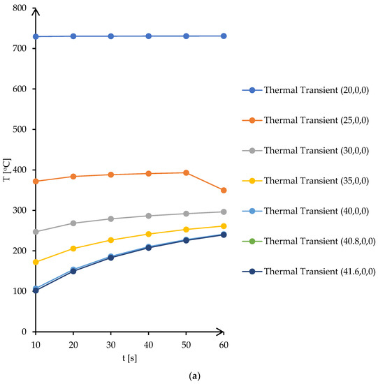 where A (mm2) is the heating transfer area, Th (°C) is the highest temperature obtained from the conversion of the microwaves into heat, Tc (°C) = 25 °C is the ambient temperature considered for simulation and L (mm) = 58 mm represents the total length of the assembly. The simulation was performed considering thermal transient for a boundary time of the 60 s and temperature limit recorded by infrared pyrometer, on the top of copper plates, up to 270 °C. This temperature is considered more than enough to achieve soldering in the microwave field of the copper plates. On the other hand, the time step size for transient thermal analysis is related to element conduction length and material properties. For the simulation, a time step was chosen by taking into consideration Equation (3):