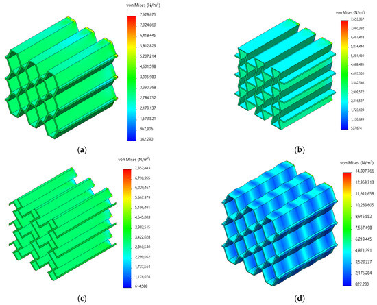 The main reason why bionic lightweight structures have good cushioning performance is that they can exhibit a series of deformation processes under compressive loads [44]: linear elastic deformation–elastic buckling–plastic collapse–brittle damage. The location of the initial deformation of the material directly determines the overall deformation pattern of the structure. Therefore, finding the location of the maximum stress point of the model during the elastic–plastic deformation phase is an important part of predicting the controllable deformation of the structure. The simulated stresses during the elastic–plastic phase follow the Von Mises failure criterion in order to investigate the location of the onset of stress deformation in the structure.