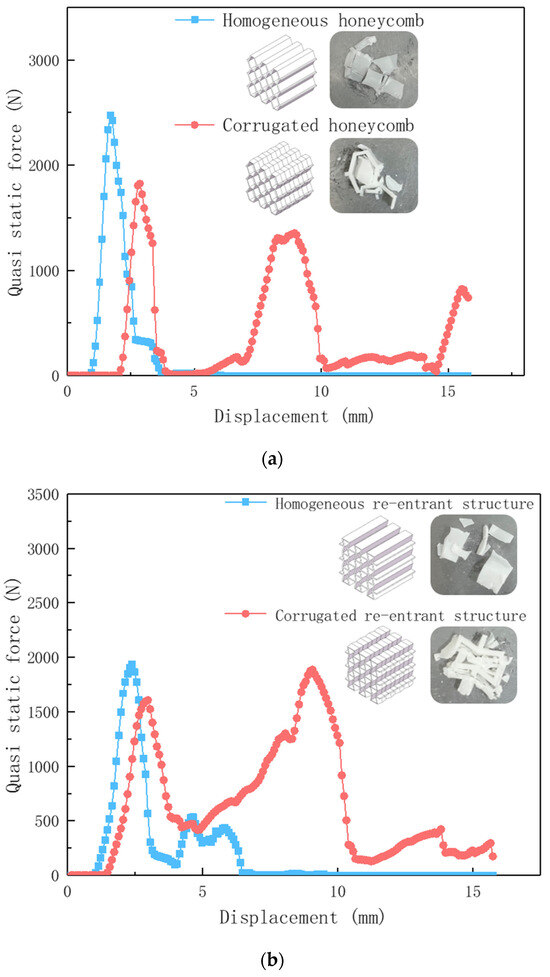 Figure 8a shows the bearing capacity change curve of the homogeneous irregular hexagonal structure and the corrugated irregular hexagonal structure at every moment. The homogeneous structures had higher load-bearing points. Then they quickly fell back and maintained a very low bearing level, and the structure basically lost its bearing capacity at this time. The overall pattern appeared to be a single narrow crest. After the first structural failure, the subsequent bearing capacity was insufficient and the structural integrity was almost completely lost. On the other hand, the maximum bearing capacity of the corrugated irregular hexagonal structure was lower than that of the homogeneous hexagonal structure, reaching 73.69%. This could be because the structure has a more complex distribution of forces. However, the corrugated structure had a second wave peak, and the highest bearing capacity of the second wave peak reached 73.76% of the first wave peak. The overall load-carrying capacity was higher, and complete structural damage did not occur after the initial impact. The structure still retained a certain level of load-carrying capacity even after the first impact. The damage morphology of the two samples was compared and analyzed. The uniform irregular hexagonal structure was completely damaged and the original morphology was lost, while the corrugated irregular hexagonal structure was seriously damaged. But, the sample morphology before damage was maintained to a certain extent, and the strength and supporting capacity were greatly weakened.