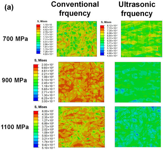 Figure 9 shows the local residual stress distribution through CPFEM for different specimens at different loading frequencies and stress amplitudes. The results were captured after the 100th cycle. It is seen that, for cases loaded at ultrasonic frequency and low stress levels, the local stress distribution is relatively uniform (Figure 9a 700 MPa, 900 MPa; Figure 9c 550 MPa, 600 MPa). In other cases, the stress concentration occurs along the boundaries of grains, especially at the junction of more than two grains. The difference in orientation among adjacent grains is considered the main cause leading to the phenomenon. It is shown that the local residual stress is much lower when loaded under the same applied load but at ultrasonic loading frequencies, suggesting smaller fatigue damage under ultrasonic frequency loading.
