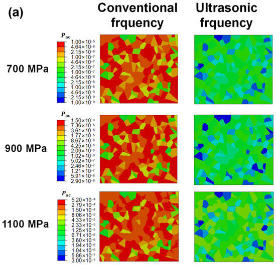 Figure 10 shows the accumulated plastic strain fields in CPFEM models of T.T. 300 °C, 450 °C, and 600 °C under different applied loads, respectively. It is clearly seen that plastic strain exists even as applied loads are lower than yield stress due to the inhomogeneous deformation of grains, but the accumulated plastic strain (Pac) is uniformly distributed within most of the grains. During the simulation process, it is also observed that the accumulation of plastic strain starts around the boundaries and then develops to the interior of grains during the cyclic loading process. A few grains also show the phenomenon that the deformation is relatively uneven in a single grain (Figure 10a, 1100 MPa, 52.5 Hz; Figure 10b, 52.5 Hz; Figure 10c, 52.5 Hz) after 100 cycles of loading. For the specimens T.T. 600 °C loaded under 700 MPa, the locations of grains with a higher accumulated plastic strain are just the same as those bearing larger stress, as the applied load is at peak and valley values. The stress difference between adjacent grains and plastic strain accumulation is caused by the misorientation of grains. Because the fracture of specimens generally occurs under tensile load, the grains bearing a higher tensile stress are possible locations for crack initiation, especially as a specimen is loaded at conventional frequency.