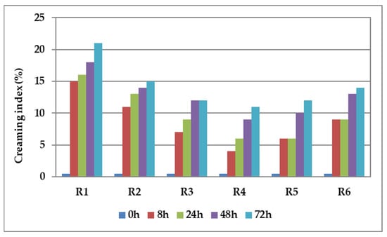 For practical applications, it is essential to ensure the long-term stability of the emulsions. At 22 °C, the stability of the emulsion was assessed by examining the creaming index over storage periods of 8, 24, 48, and 72 h. The variations in the calculated creaming index values are graphically depicted in Figure 1.