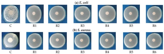 Images of Petri plates after 24 h of incubation of cotton-treated fabrics with E. coli or S. aureus strains can be observed in Figure 2, and the assessment of antibacterial activity is presented in Table 5.