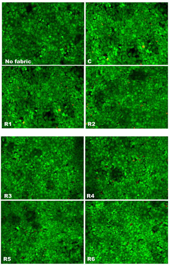 Fluorescence images of Live and Dead staining of human keratinocytes (HaCaT cells) grown for 24 h in the presence of extracts from emulsion-treated fabrics (R1–R6) or untreated fabrics (C). Live cells are shown in green (after staining with calcein AM solution) and dead cells are presented in red (labeled with propidium iodide solution). In parallel, cells without any fabrics were analyzed. All images were obtained with 20× objective.