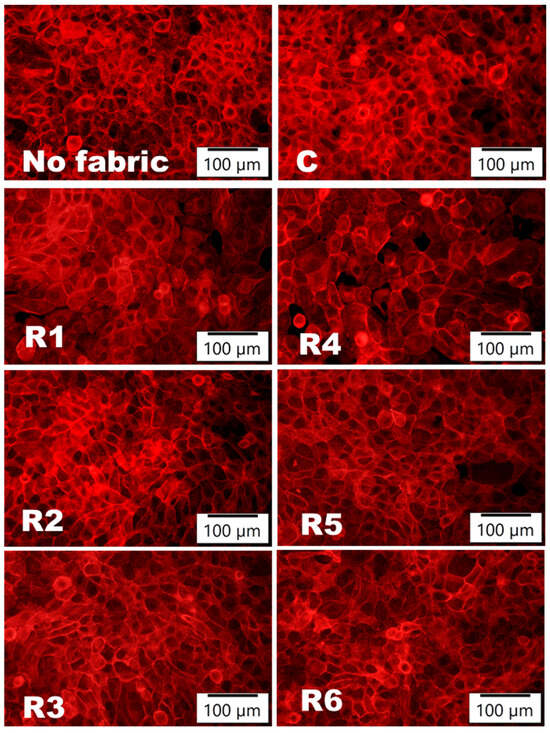 Organization of actin filaments (labeled in red with phalloidin-iFluor 555 reagent) in human keratinocytes (HaCaT cells) after 24 h of incubation in direct contact with emulsion-treated fabrics (R1–R6) or untreated fabrics (C). In parallel, cells without any fabrics were analyzed.