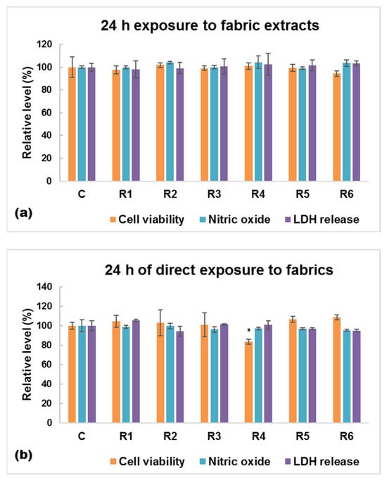 Biocompatibility in terms of cell viability, nitric oxide level, and lactate (LDH) dehydrogenase evaluated on human keratinocytes (HaCaT cells) after 24 h of growth: (a) in the presence of fabrics extracts, and (b) in direct contact with the emulsion-treated fabrics. Data are calculated as mean ± standard deviation (n = 3) and normalized to HaCaT cells grown: (a) in the presence of extracts from untreated fabric (C—control), (b) in direct contact with untreated fabric (C). No significance was obtained after statistical analysis was performed between fabric extracts. * p < 0.5 compared to untreated fabrics (C).