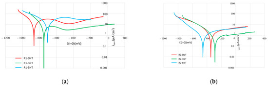 The position of the Tafel plots for the R2-0NT and R2-5NT samples (Figure 6b) indicates an increase in the probability of corrosion rather than an acceleration of processes, quantified by the corrosion rate value; the corrosion rate potential of the R2-5NT sample is shifted towards negative values. This is once again evidence that an excess of NT is not beneficial and that there is a need to identify the optimum NT addition in each case. Taking all this information into account, as well as the OCP result, it can be concluded that sample R2-3NT has a better corrosion resistance, meaning that this sample’s composite matrix gives the best corrosion protection to the embedded reinforcement.