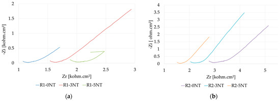 In the case of partially substituting NA with GBA within the matrix, some aspects are potentially observed due to the importance of the substituent’s nature, as previously mentioned. When analyzing the reinforcement that contained no NT (R4-0NT), the OCP has a negative trend between the 0 and 102 min interval, showing an obvious tendency for corrosion. The potential shifts towards positive values (form −444 mV to −383 mV) in the time interval from 102 to 385 min indicate a tendency to stabilize and the formation of the protective oxide layer. After that, the potential is relatively constant between the 358 and 1002 min mark, with a slight negative shift towards the end of the measurement from −389 mV to −400 mV. As a result, it is evident that the steel surface corrodes in the first phase, releasing iron ions into the solution; this is followed by the formation of a stable oxide layer that eventually dissolves partially at the conclusion of the test time.