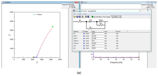 The identification of the electric circuit equivalent to the best phonon is presented in Figure 8b, where the CPE is a constant phase element in which the CPE-T has the dimensions of a capacitor that has “reinforcement” formed by iron ions that are practically on the surface of the steel armature and electrons left by the ions in the metal. The electric charge is characterized by the CPE-P factor; the closer its value gets to unity, the more localized the charge. Other parameters determined are CPEox, corresponding to the iron oxide layer formed; Rox, representing the resistance of the oxide layer; Rp, representing the polarization resistance of the armature; and Rs, representing the resistance of the solution. The values for these parameters are detailed in Table 4.