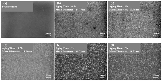 As shown in Figure 5b, the number of phases per unit area showed an overall decreasing trend. At the same aging duration, the number of phases per unit area at 800 °C was significantly higher than at 850 °C. This is because at higher temperatures, the diffusion rates of solute atoms and vacancies are greater, resulting in a faster dissolution rate of smaller-sized phases. Therefore, the higher the temperature, the lower the particle density at the same aging time.