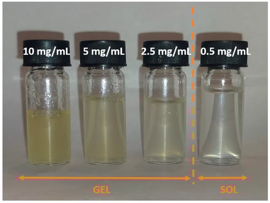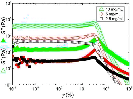 The rheological characterization of gels was carried out with a stress-controlled rotational rheometer (Anton Paar MCR302, Graz, Austria). The temperature control system is a Peltier with an electrically heated hood (P-ETD300 and A-ETD300, Anton Paar, Graz, Austria). Hot solutions prepared from the stock solution were loaded at 85 °C under the plate geometry (diameter 40 mm) and dodecane was used to cover the rim of the sample and avoid water loss. All tests were performed between 250 and 300 microns with a gap controlled by the normal force set to 0 N during the cooling of the hot solution from 85 °C to 30 °C in 1 h. This gap control allows the reliable determination of the linear viscoelastic properties of gels []. Right after cooling, the mechanical spectrum of the formed gel was recorded by sweeping the frequency from 100 Hz to 0.01 Hz with a strain of 0.1%. Finally, a sweep in the amplitude of the oscillatory shear strain was performed from 0.01% to 1000% (20 data points per decade) with a frequency of 1 Hz to confirm that measurements during the recording of the mechanical spectrum at 25 °C were carried out within the linear regime of viscoelasticity and additionally to characterize the large deformation behavior of the gels.