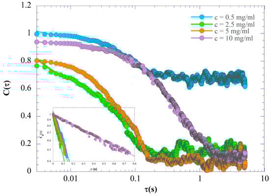 The time correlation function of the scattering intensity, C(τ), of the KIMN samples prepared with four different concentrations and measured at a temperature of 20 °C. The inset presents the semi-logarithmic variation of C0(τ) vs. τ (see Equation (2)).