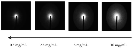 Using USALS, the evolution of the structural organization of KIMN solutions and gels through the sol–gel transition can be studied by acquiring scattered images at different times at a fixed point of the optical cell. USALS, along with small-angle X-ray or neutron scattering, allows one to obtain more information about the structure of fractal objects as it explores the reciprocal space q. Fractal dimensions can be calculated from slopes of log–log plots of scattered intensity versus scale. As irregular, complex shapes, fractals possess two important properties, notably self-similarity and scale invariance, and can be characterized by their degree of irregularity or complexity using fractional dimensionality (also known as their fractal dimensions introduced by Mandelbrot) []. The USALS technique has been carried out in our laboratory using a setup developed by Ferri []. The experimental technique and the theory are described in detail elsewhere []. Figure 3 shows the resulting light scattering patterns as a function of hybrid-carrageenan concentration.