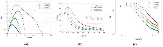 ImageJ (concentric circles plugins) software (version 1.53k) was used to extract USALS intensity profiles from the scattering patterns measured at different concentrations (T = 20 °C) and the possible conformation of hybrid carrageenan can be estimated as a first approximation from the shape of the pair-distance distribution function P(r), calculated from the form factor P(q) by indirect Fourier transform (IFT) analysis. Figure 4a shows the unnormalized distribution functions at different values of r. P(r) is sensitive to concentration effects and sample polydispersity. Not all profiles are symmetrical, manifesting the non-spherical distribution of colloidal density. In addition, the difference in the size is clearly visible as the profiles reach zero values at different values of r labeled here as Dmax, P(Dmax) = 0. Figure 4a shows that Dmax abruptly grows when the concentration increases, see the corresponding values reported in Table 2. Dmax gives an idea of the maximum diameter of the scattering round clusters. In addition, for the first two concentrations (0.5 and 2.5 mg/mL) the P(r) curve has a fairly broad, bell-shaped maximum. The maximum in P(r) is also shifted with the concentration towards distances less than Dmax/2 and this corresponds to a network composed of flattened particles [].