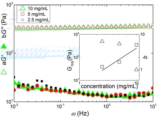Master curve of mechanical spectra of KIMN gels measured at 30 °C by cooling hot solutions with different polysaccharide concentrations: 2.5 mg/mL (squares), 5 mg/mL (circles) and 10 mg/mL (triangles). Superimposition of curves is achieved by vertically shifting moduli G′ and G″ by a factor a or b, respectively. Inset: concentration dependence of the shift factor b (triangles) and of modulus G′ measured at 1 Hz (G1Hz, squares), which also represents the concentration dependence of the shift factor a since G″ is virtually non-frequency-dependent. The line indicates a power law fit to the G1Hz data with computed exponent 1.61 ± 0.75.