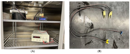 Embedded resistance set-up. (A) Data logger resistance probes connected to concrete. (B) Resistance probe.