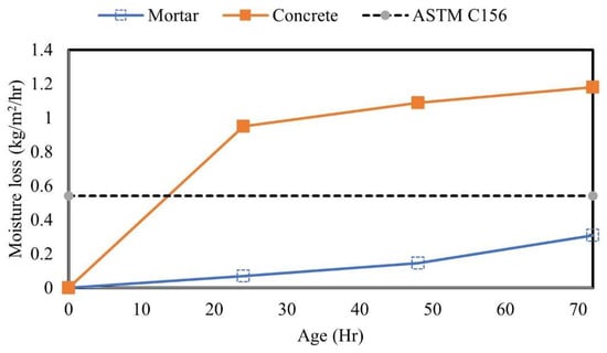 Figure 3 shows the comparison of moisture loss performed on the standard reference mortar and on the paving concrete cured following the ASTM C156 standard. As expected, both specimens experienced moisture loss throughout the curing period, with the most moisture loss observed during the first 24 h. After 72 h of curing, the mortar specimens had less moisture loss compared to concrete. The high moisture loss observed in concrete could be due to the presence of coarse aggregates that cause more bleed water during the early time stages of concrete.