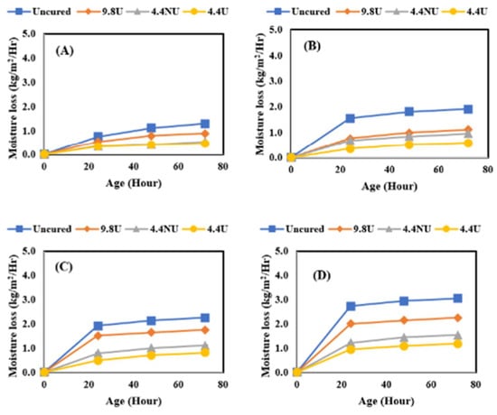 Figure 4 presents the comparison of moisture loss results performed on concrete only while varying the application rates and curing conditions. The four application rates were 0 m2/L, 9.8 m2/L applied using a brush, 4.4 m2/L non-uniform applied using a pump sprayer, and lastly, 4.4 m2/L uniformly applied using a pump sprayer; the four evaporative conditions were identified as low, medium, moderate, and high. The low evaporative condition (A) was performed at 10 °C and 75% RH with an estimated evaporation rate of 0.00732 kg/m2/h. The medium evaporative condition (B) was performed at 23 °C and 50% RH with an evaporation rate of 0.1515 kg/m2/h. The moderate evaporative condition (C) was performed at 32 °C and 50% RH with an evaporation rate of 0.4098 kg/m2/h. The high evaporative condition (D) was performed at 38 °C and 32% RH with an evaporation rate of 0.7585 kg/m2/h. The data presented are average values from triplicate testing. As expected, the moisture loss from the samples increased with higher evaporative conditions with the uncured samples having the greatest moisture loss. The effect of application rate and quality became more noticeable with the increased evaporation rate. At the lowest two evaporation rates, the uniformity and rate were not significant factors. At the highest two evaporation rates, the uniformity was less important than the application rate.