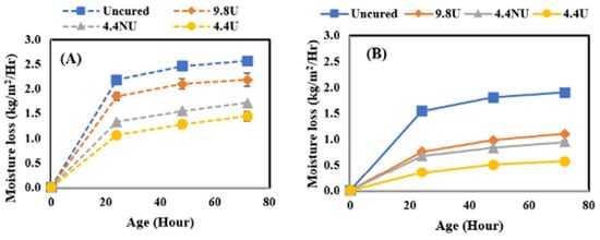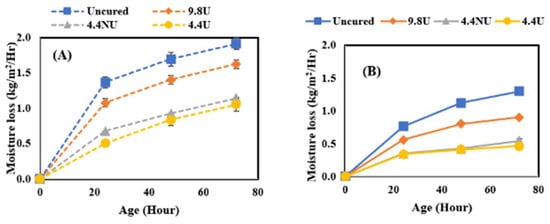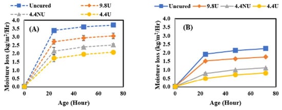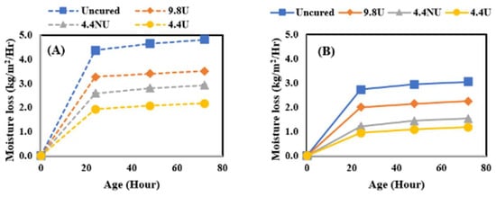 In this study, the effect of curing compound application time was further investigated by comparing the moisture loss behavior of concrete when MFCC was applied directly after final surface finishing (120 min before the initial set) or after the initial set (210–240 min from the time when cement met water). It should be noted that the evaporative conditions of the laboratory are quite low resulting in a much longer time for bleed water to evaporate than would be experienced in field conditions. The comparison was performed by comparing moisture loss after 72 h of curing for all four application rates identified as uncured, 400 U, 180 NU, and 180 U and four curing conditions. Figure 5 shows the results for the lowest, Figure 6 for the medium, Figure 7 for the moderate, and Figure 8 for the highest evaporative conditions. In all cases, the samples where MFCC was applied while bleed water was present had the greatest moisture loss. While some of the difference can be attributed to evaporation during the 120 min between the before and after conditions, the additional moisture loss is more than can be attributed to evaporation alone. It has been well described that in all but the harshest conditions, most of the bleed water is reabsorbed as pores empty during hydration []. Applying the MFCC to wet concrete likely dilutes the chemicals and creates a more permeable final film. Whatever the mechanism, it is important to ensure that the MFCC is applied after bleed water is no longer present. While the timing is important, the slow loss of bleed water corresponds to low evaporative conditions which are much less sensitive to curing effects and likely not of high importance.