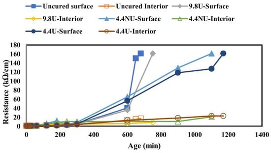 Concrete goes through a phase change from a plastic phase to a solid at an early age. This transition is mainly caused by the hydration reaction []. During the early age of concrete, cement reacts with water to produce hydration reaction products, and the excess water evaporates due to drying, leading to concrete microstructure development. However, at an early age, the presence of moisture in concrete makes concrete less resistant to current flow, as the electrical current in concrete moves through the pore spaces. With time, more pore spaces in concrete are filled up with hydration reaction products. Subsequently, concrete becomes more resistant to the current flow, as the electrical conductivity ability of concrete depends on the conductivity of the fluids inside the interconnection of the pore system, the degree of saturation of the concrete, and the permeability. Therefore, using the resistance technique to trace moisture content in concrete can be an important tool to assess curing compound application effectiveness on fresh concrete.