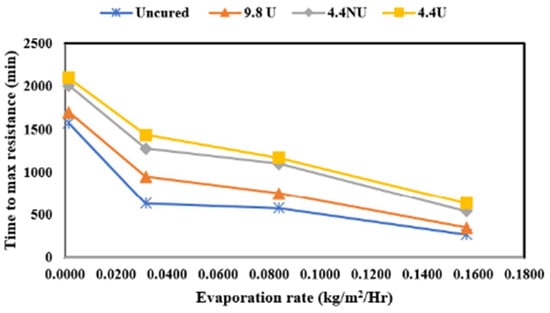 The effect of the evaporative conditions was investigated by curing concrete in four evaporation rates named low (0.00732 kg/m2/h), medium (0.1515 kg/m2/h), moderate (0.4098 kg/m2/h), and high (0.7585 kg/m2/h). For each evaporation rate, concrete specimens were cured using the four application rates of uncured, 9.8 U, 4.4 NU, and 4.4 U. Presented in Figure 10 is the surface resistance time to maximum resistance for each application rate plotted against the evaporation rate.