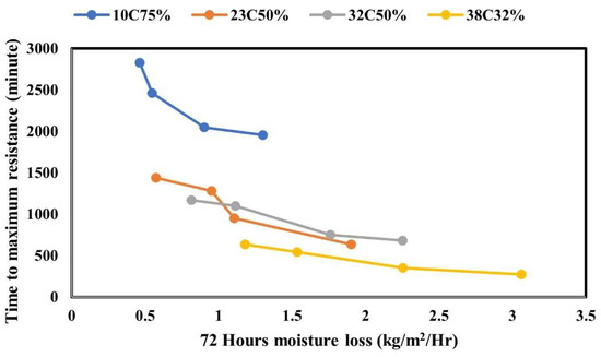 The relationship between the moisture loss and embedded resistance was developed by plotting the surface resistance time to the maximum resistance value against moisture loss after 72 h of curing. The results presented in Figure 11 are for all four application rates (uncured, 9.8 U, 4.4 NU, and 4.4 U) and the four evaporative conditions mainly low (0.00732 kg/m2/h), medium (0.1515 kg/m2/h), moderate (0.4098 kg/m2/h), and high (0.7585 kg/m2/h). The embedded resistance test is inversely proportional to the moisture loss. The results demonstrated that specimens with higher moisture loss have a shorter time to the maximum resistance value. In all cases, regardless of the evaporative conditions, uncured specimens had a higher moisture loss than the other specimens and at the same time presented a faster surface resistance, followed by 9.8 U and 4.4 NU, lastly, the 4.4 U specimens had a low moisture loss in all the evaporative conditions. This trend was consistent with the embedded resistance results where the 4.4 U specimens had the longest time to the maximum resistance values.