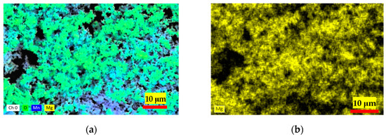 Elemental mapping by EDS analysis for Mn2O3 powder. (a) Multi-elemental distribution of Mn, Mg, and O elements; (b) Mg distribution; (c) Mn distribution; and (d) O distribution.